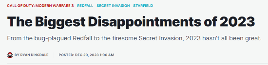 IGN官方发文总结了2023年最令人失望的影视/游戏作品,影视方面有崩坏的漫威电影宇宙,游戏方面有《星空》《红霞岛》等。
