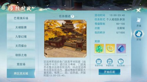 只要你的战力达到15万,即可在每周二、四、日10:00-23:30参与【跨区流光城】报名,60级以上少侠可个人参与,也可组队前往,每个队伍最多5人!