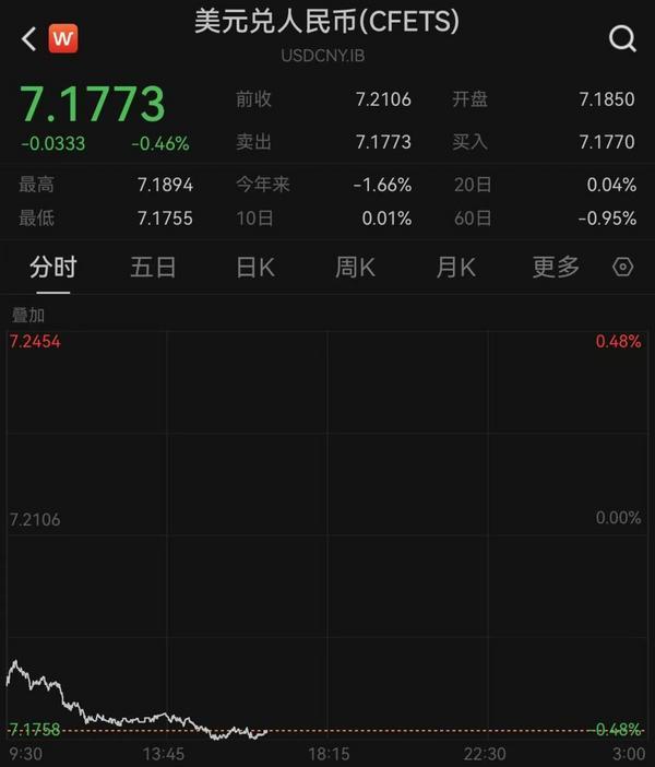 8月4日,人民币对美元即期汇率大涨超300点,截至发稿盘中**升至7.1755,16时30分收于7.1766,较上一交易日上涨340个基点,这一升幅创下5月6日以来的**值。