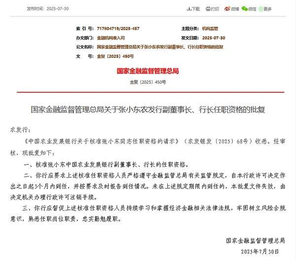 财经8月11日讯 近日,**金融监督管理总局公布相关批复显示,核准张小东**农业发展银行副董事长、行长的任职**。