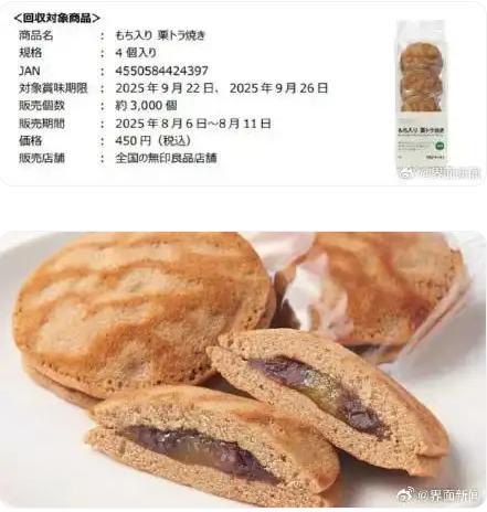 8月13日,日本良品计画公司发布消息,旗下品牌无印良品对一款零食进行自主回收。此次召回的产品为4枚装栗子铜锣烧,原因是部分原料中可能混入异物。 另据**新闻消息,经核查,此款问题铜锣烧并未在**大陆的无印良品门店销售。