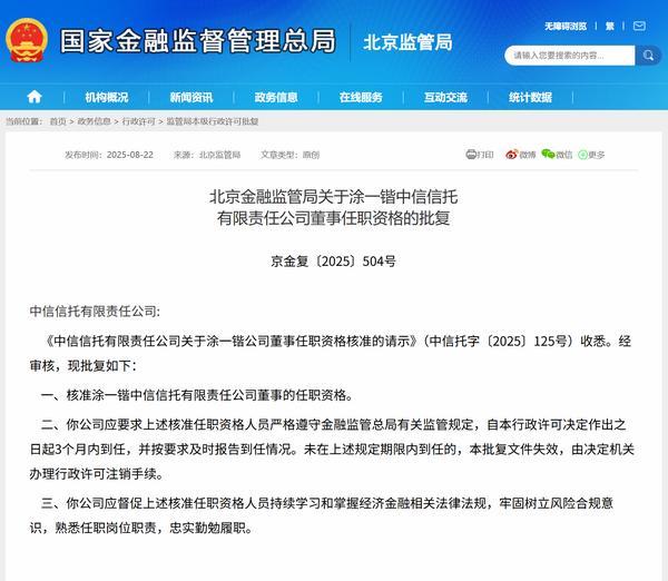 财经8月22日讯 今日,北京金融监管局公布相关批复,核准涂一锴中信信托有限责任公司(简称“中信信托”董事的任职**。以下是相关批复正文: