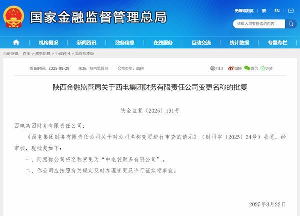 财经8月29日讯 今日,陕西金融监管局公布相关批复,同意西电集团财务有限责任公司将名称变更为“中电装财务有限公司”。以下是相关批复正文: