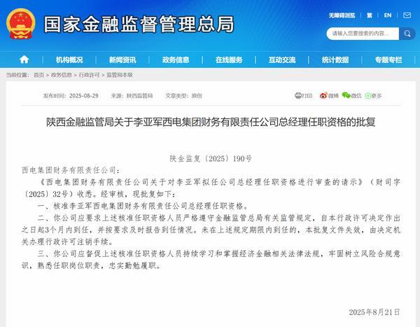 同时,陕西金融监管局核准李亚军西电集团财务有限责任公司(现“中电装财务有限公司”总经理任职**。以下是相关批复正文: