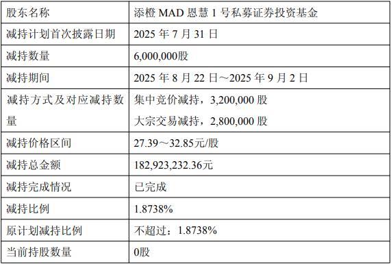 2025年8月22日至2025年9月2日,添橙基金通过集中竞价交易方式减持公司股份3,200,000股,通过大宗交易方式减持公司股份2,800,000股,减持价格区间为27.39元/股至32.85元/股,减持总金额为182,923,232.36元。截至公告日,减持计划已实施完毕。