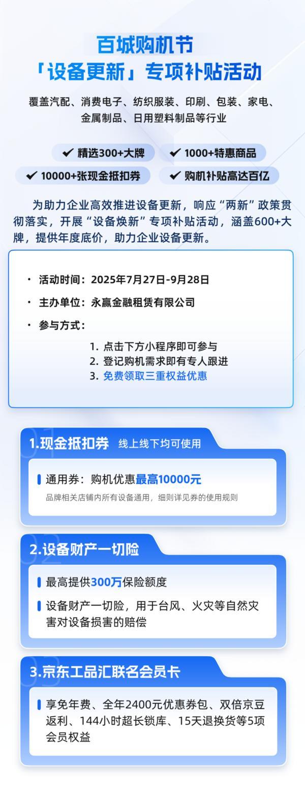 作为永赢金租旗下的工业设备服务平台,“设备之家”已携手超5500家设备厂商与经销商,服务企业会员超30万,累计成交金额突破55亿元。这次“百城购机节”,既是响应**制造业设备更新政策的实际行动,更是与加工企业并肩同行的暖心实践。