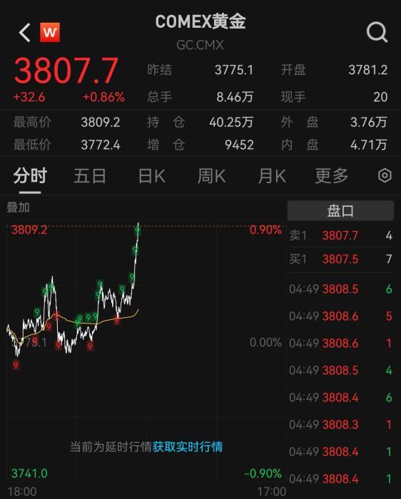 截至17时5分,COMEX黄金突破3800美元大关,**触及3809.2美元/盎司,**涨幅0.9%,本月累计涨幅约8%;伦敦金现突破3780美元关口,**触及3780.569美元/盎司,**涨幅0.93%,本月累计涨幅约9%。