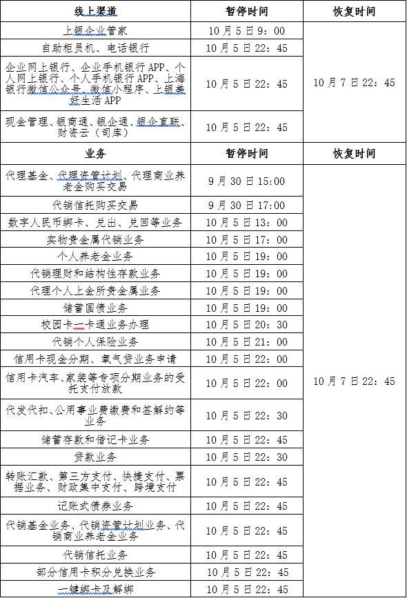 答:为确保我行核心系统顺利升级,9月27日至10月7日22:45暂停我行门户网站、上行惠相伴公众号和小程序、上海银行公司金融公众号等渠道预填单业务;暂停一窗通开户、账户变更或销户预约业务。