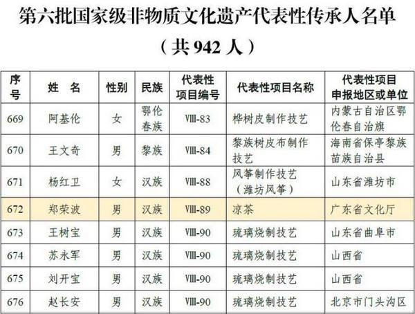 今年3月文化和旅游部公布了第六批**级非物质文化遗产代表性传承人名单,郑荣波为该批次中**以“凉茶”为代表性项目的传承人。