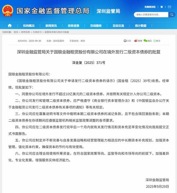 财经10月10日讯 日前,深圳金融监管局发布相关批复,同意国银金融租赁股份有限公司(简称“国银金租”在境外发行不超过10亿美元的二级资本债券,并按照有关规定计入国银金租二级资本。