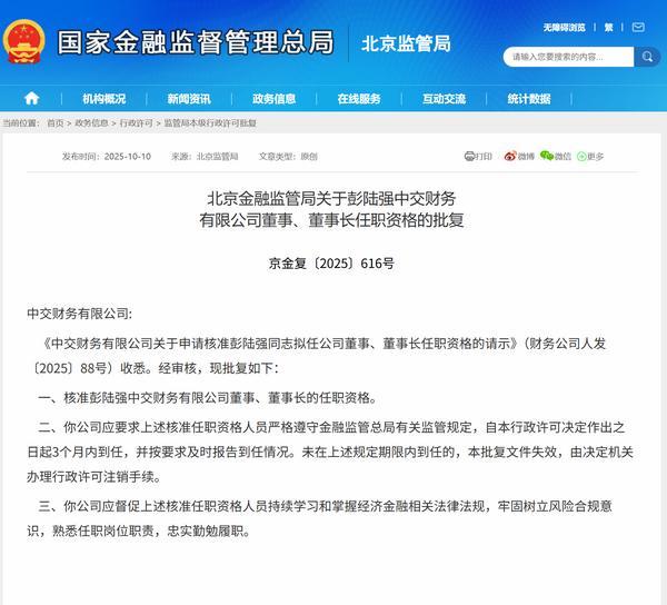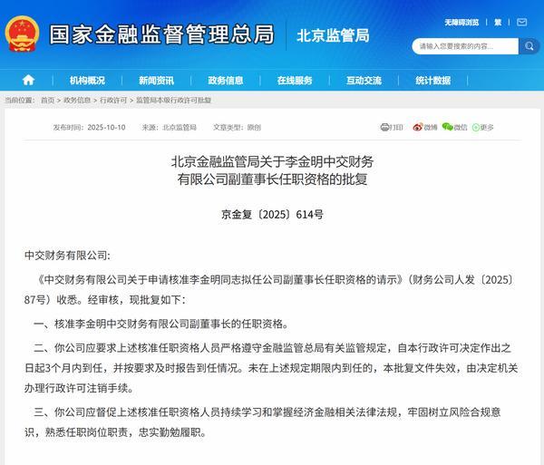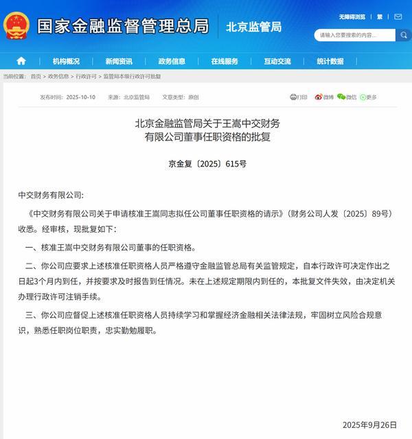 同时,北京金融监管局核准**中交财务公司副董事长的任职**,核准王嵩中交财务公司董事的任职**。以下是相关批复正文: