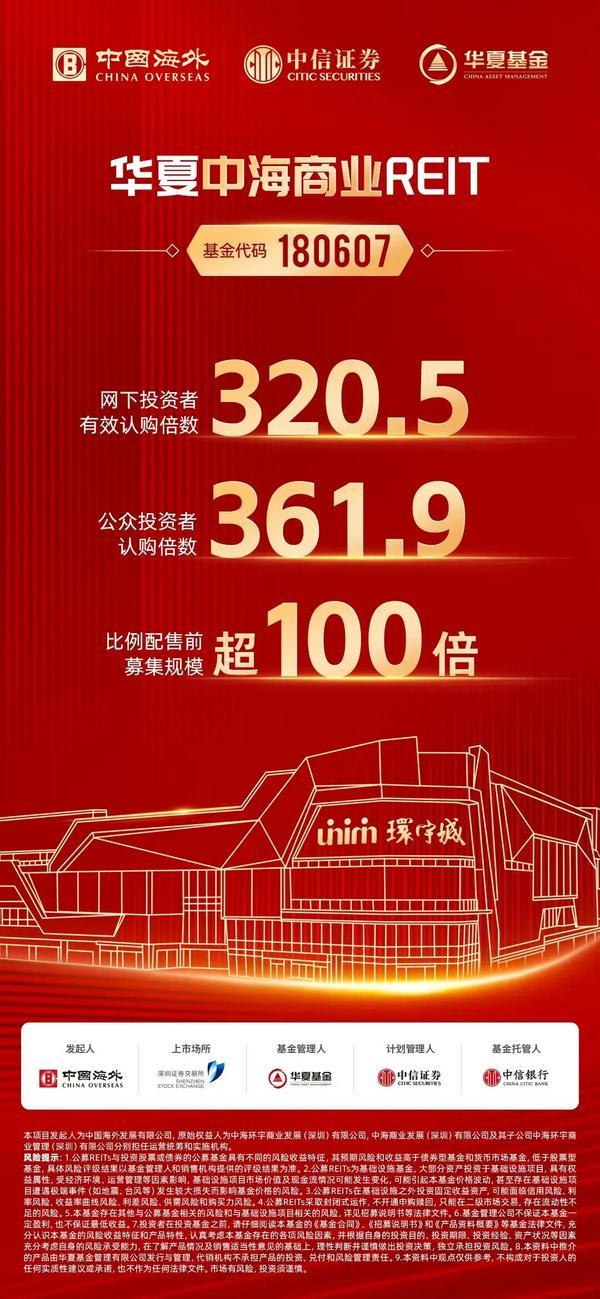 备受市场关注的消费REITs——华夏中海商业REIT(基金代码:180607发售结果揭晓。
