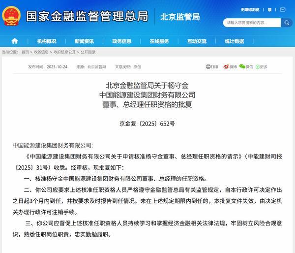 财经10月27日讯 日前,北京金融监管局公布相关批复,核准杨守金**能源建设集团财务有限公司(简称“**能源建设集团财务公司”董事、总经理的任职**。以下是相关批复正文: