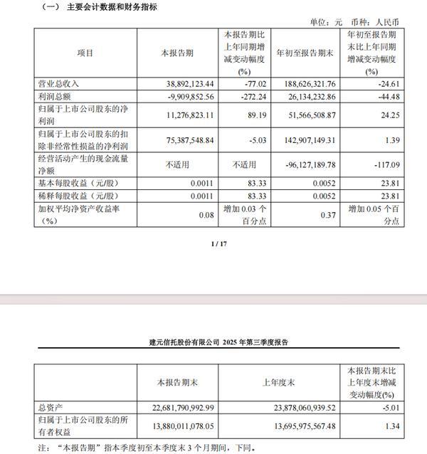 财经10月29日讯 今日,建元信托(股票代码:600816.SH公布三季报显示,2025年1-9月,建元信托实现营业总收入1.89亿元(188,626,321.76元,同比下降24.61%;实现归属于上市公司股东净利润5156.65万元(51,566,508.87元,同比增长24.25%;归母扣非净利润1.43亿元(142,907,149.31元,同比增长1.39%。截至三季度末,建元信托总资产达226.82亿元(22,681,790,992.99元,较上年末下降5.01%。