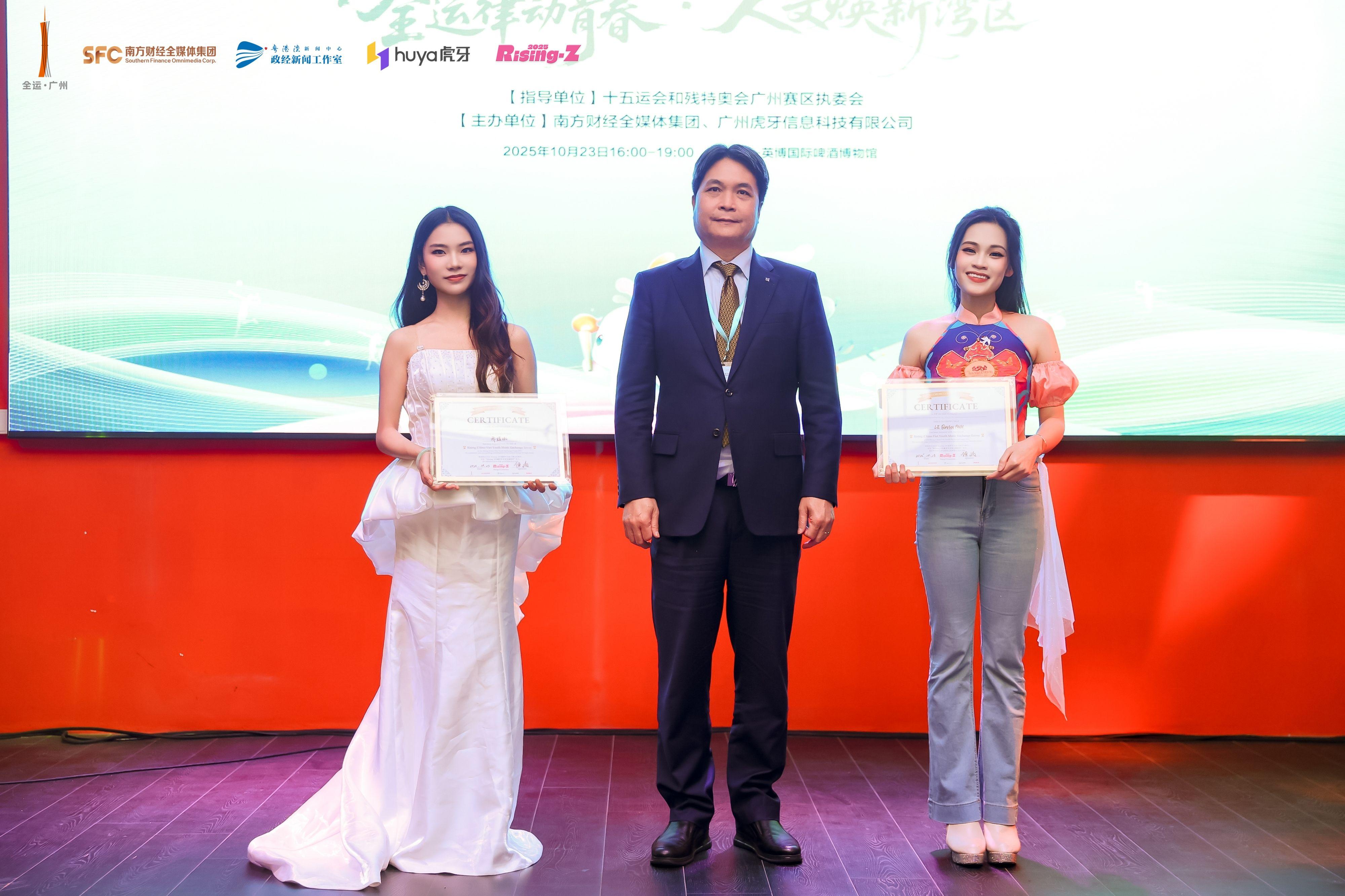 表演结束后,现场举行了“RisingZ中越青年音乐交流大使”颁奖仪式,越南驻广州总领事对在赛事中表现**、积极促进中越文化交流的青年音乐人予以表彰,激励他们继续以音乐为纽带,深化两国青年的友谊与理解。