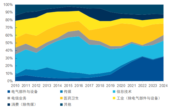 注:数据来自Wind,行业分类按照国证行业分类,2010-2023年的数据统计截至当年年末,2024年的数据统计截至12月12日。以上仅作为对指数成份股行业分布的客观展示,不作为**投资收益保证或者投资建议。指数公司后续可能对指数编制方案进行调整。