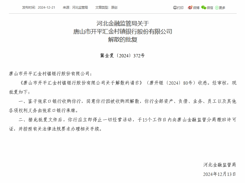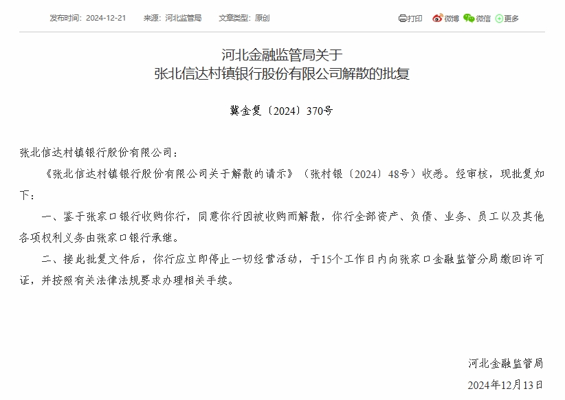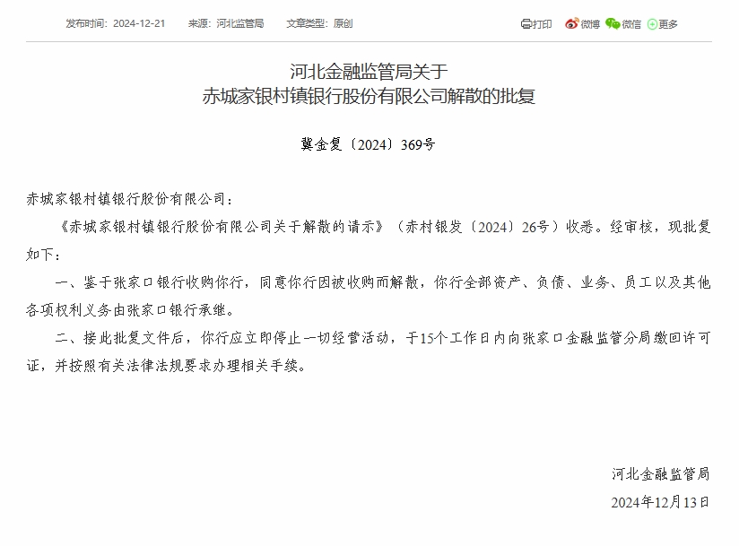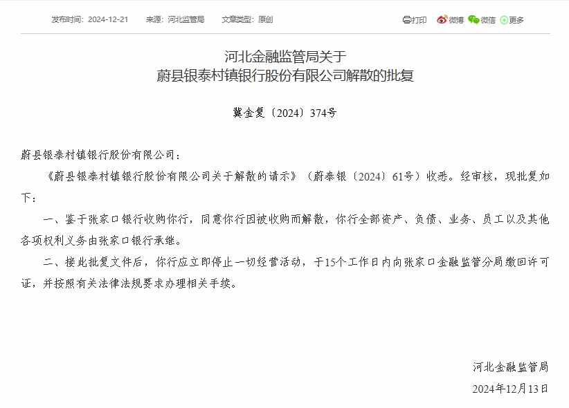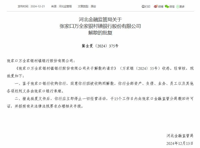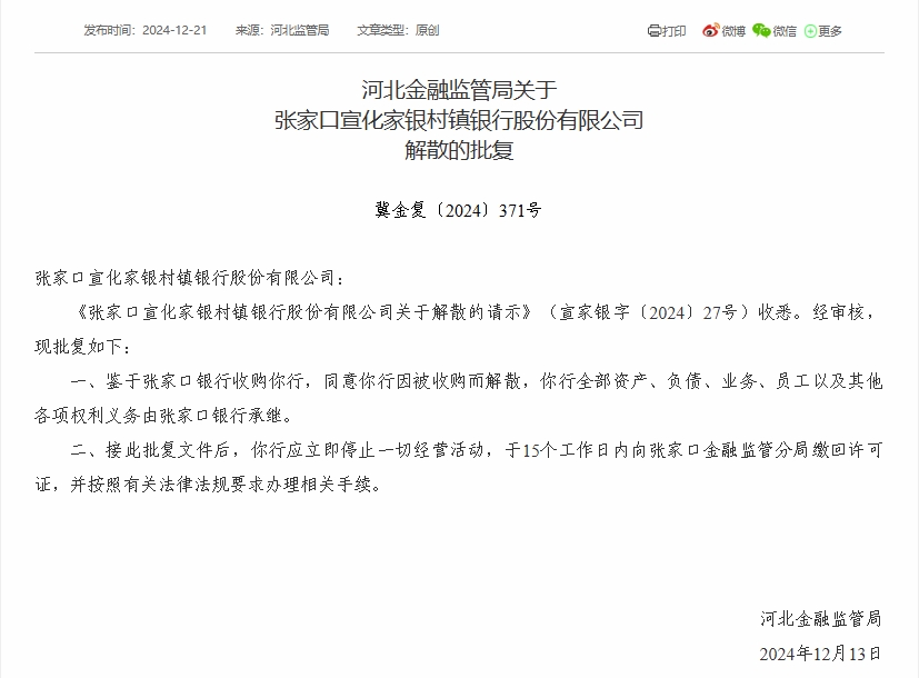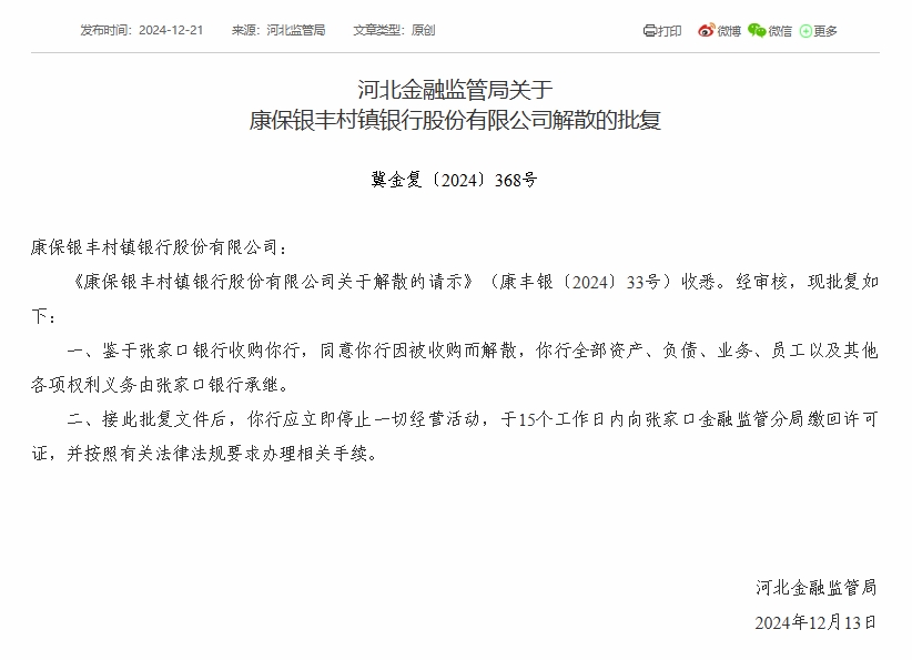财经12月23日 近日,河北金融监管局公布批复显示,7家村镇银行获批解散。批复文件显示,河北金融监管局同意蔚县银泰村镇银行、张家口万全家银村镇银行、张北信达村镇银行、张家口宣化家银村镇银行、唐山市开平汇金村镇银行、赤城家银村镇银行、康保银丰村镇银行因被收购而解散,上述7家村镇银行均由张家口银行收购。同时,上述7家村镇银行**资产、负债、业务、员工以及其他各项权利义务由张家口银行承继。