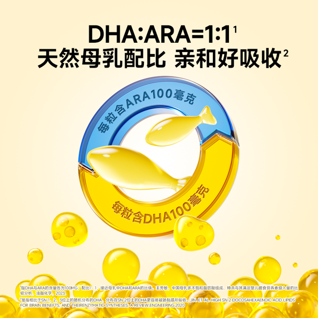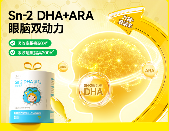 调研发现,目前市面上的主流DHA产品多为单一DHA藻油成分,而同样重要的必需脂肪酸-ARA成分则被大部分品牌忽略,基于此,窝小芽推出了一款更容易被肠粘膜吸收的sn-2 DHA,且1:1添加DHA ARA组合成分——研究表明该组合成分在促进交际能力和短时记忆力方面效果更佳。