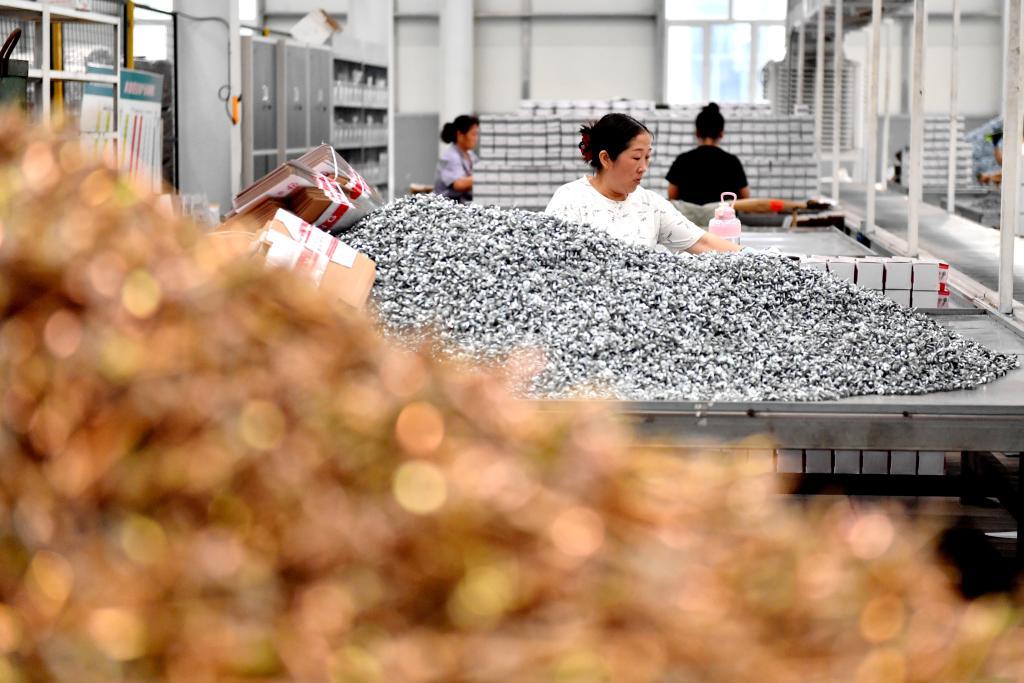 2024年8月16日,在邯郸市永年区一家紧固件生产企业,工人在包装车间内工作。新华社记者 王晓 摄