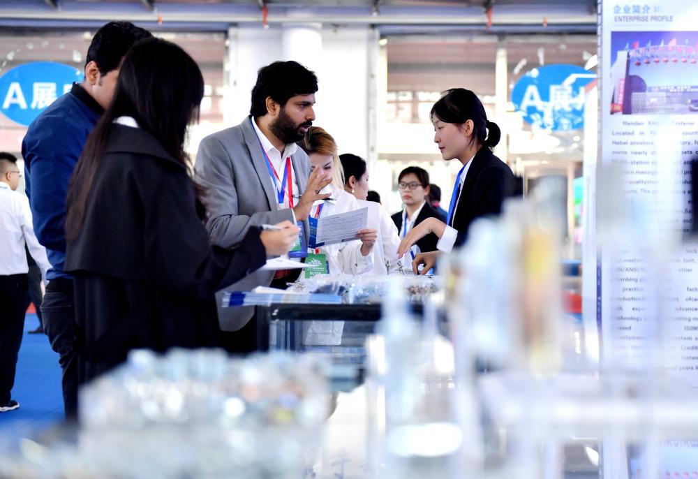 2024年10月10日,采购商(中在2024年**·永年紧固件基地**采购大会现场了解紧固件产品信息。新华社记者 王晓 摄