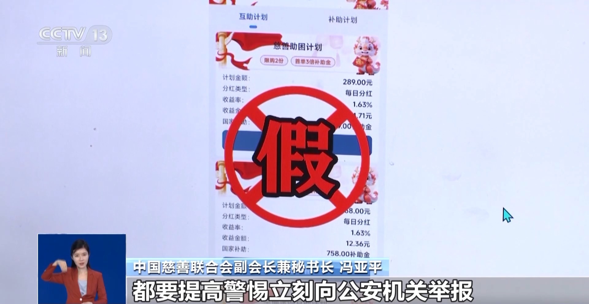 **慈善联合会副会长兼** 冯亚平:**慈善联合会从来没有开展过捐赠获利的项目。在我们接到的举报中,不法分子打着**慈善联合会的旗号,制作手机App应用程序,然后在这些平台上发布虚构的政策文件,编造所谓的“扶贫”“房补互助”等慈善项目,承诺给予高额返现或者分红作为回报,欺骗群众申购。还有一种是冒用中慈联的名义建立微信群,打着“捐赠返利”的幌子诱使大家捐款。