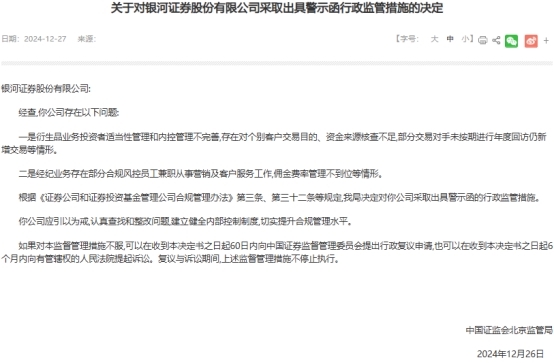 **经济网北京12月30日讯 证监会北京监管局12月27日披露了关于对银河证券股份有限公司(以下简称“**银河”,601881.SH,06881.HK采取出具警示函行政监管措施的决定。