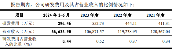 根据注册稿,2021-2023年及2024年1-6月,信凯科技的研发费用分别为411.31万元、411.11万元、552.73万元和296.46万元,占营业收入的比重分别为0.34%、0.37%、0.52%和0.44%。