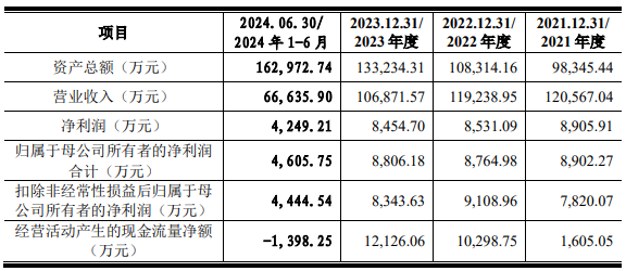 信凯科技决定自主生产的背后,是其不断下滑的业绩压力。根据注册稿,2021-2023年及2024年1-6月,信凯科技的营业收入分别为12.06亿元、11.9亿元、10.69亿元和6.67亿元,净利润分别为8905.91万元、8531.09万元、8454.7万元和4249.21万元,加权平均净资产收益率(ROE则分别为32.26%、21.74%、17.55%和8.03%。据悉,ROE是反映企业盈利能力的核心指标。