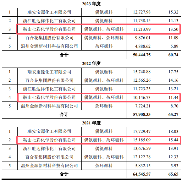 此外,信凯科技业绩数据的准确性也遭到了质疑。根据注册稿,2021-2023年,信凯科技主要向七彩化学采购偶氮颜料、杂环颜料,采购金额分别为15,185.09万元、10,146.73万元和11,213.99万元。