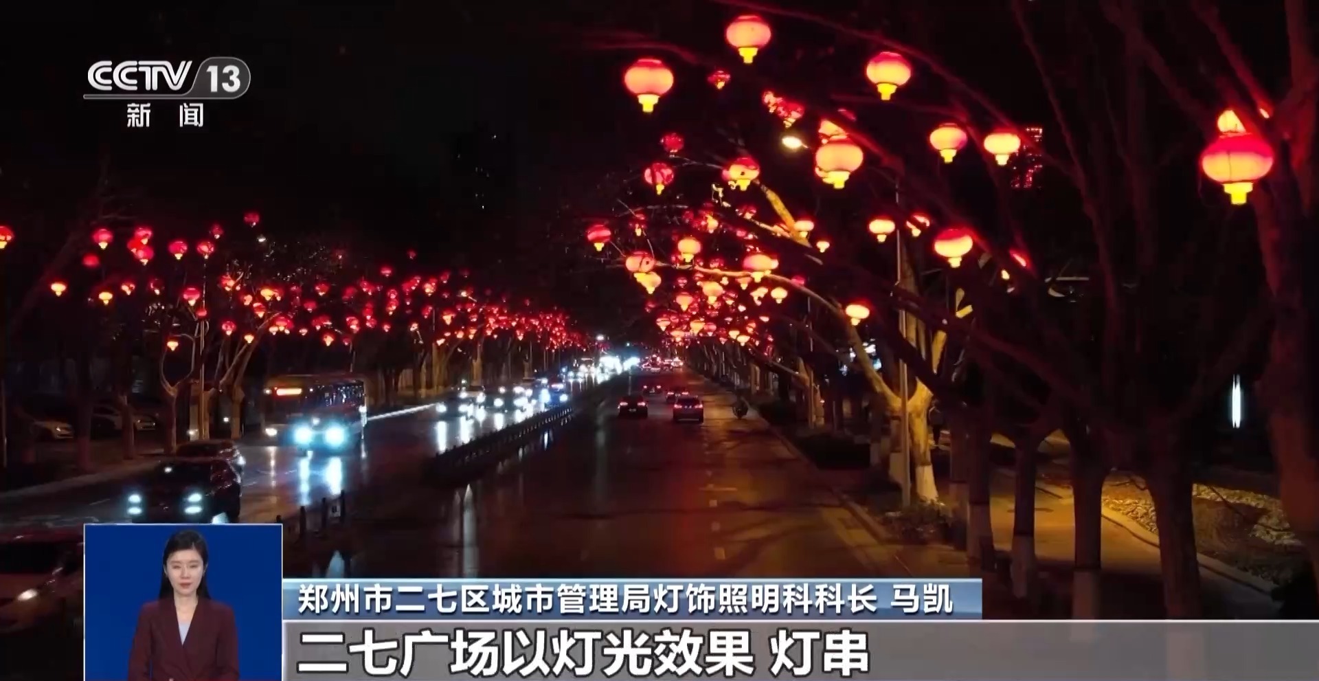 河南郑州市二七区城市管理局灯饰照明科科长 马凯:四条道路上以大红灯笼为主体,二七广场以灯光效果、灯串烘托出自己的特点。