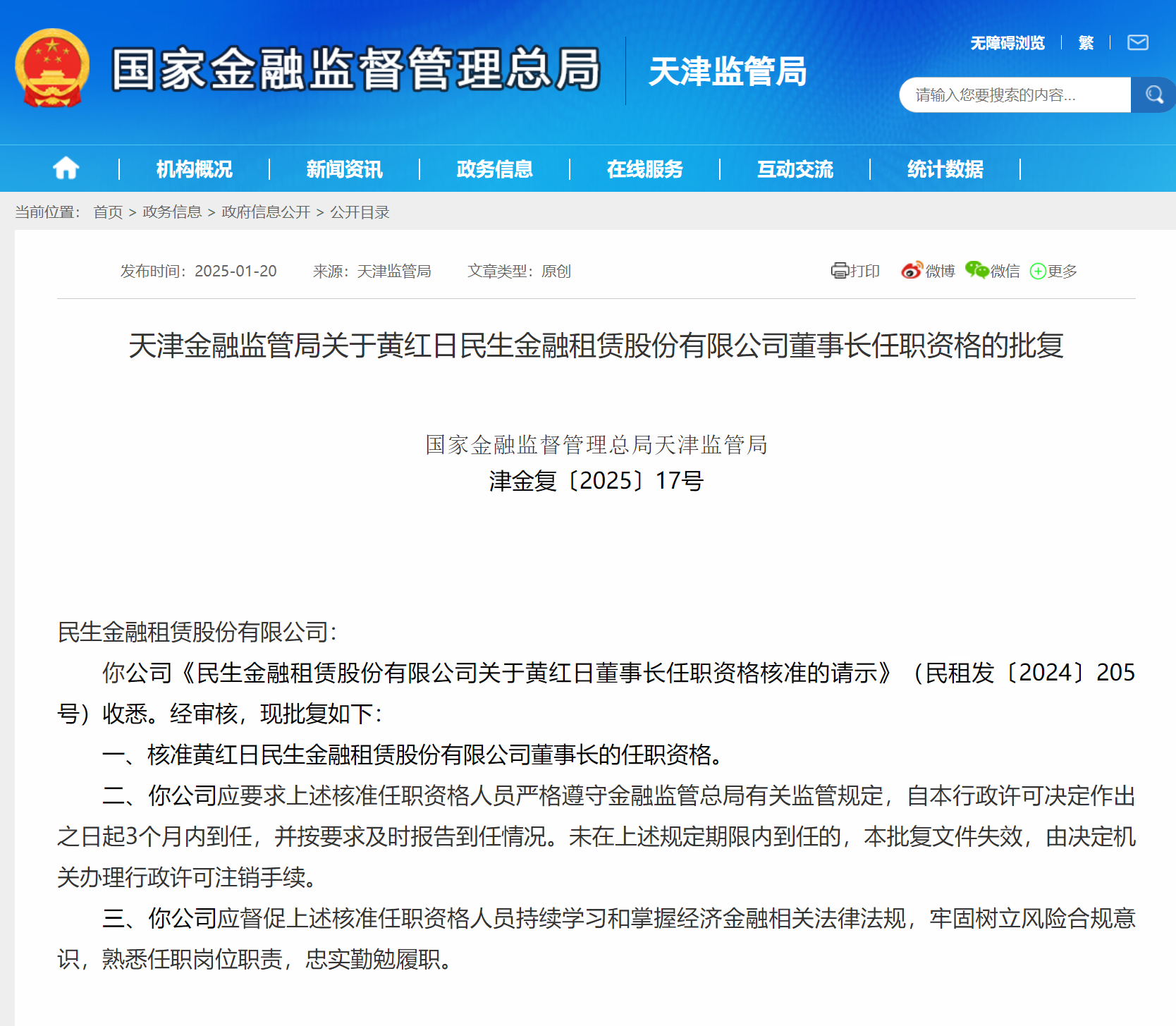 财经1月26日讯 日前,天津金融监管局公布相关批复,核准黄红日民生金融租赁股份有限公司(简称“民生金租”董事长的任职**。以下是相关批复正文: