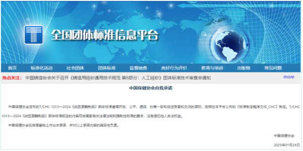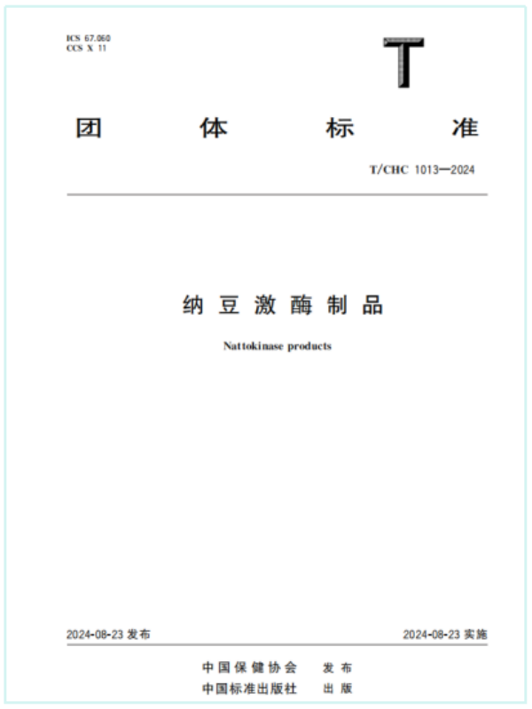 根据《**保健协会团体标准管理办法(试行》相关规定,《纳豆激酶制品》团体标准经立项、起草、征求意见、审查等标准制订程序,并通过**保健协会批准,予以发布,该团体标准于2024年8月23日起实施。该团体标准规定了纳豆激酶制品的技术要求、净含量、生产加工过程要求、检验规则、标志、包装、运输和贮存等要求;适用于以纳豆/纳豆粉为主要原料,添加或不添加其他辅料制得的纳豆激酶制品。