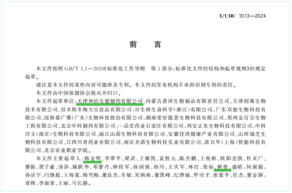 天津和治友德制药有限公司作为全球健康产业新领军企业,积极参与本次团体标准的起草制订工作,为团标建立贡献智慧与力量,并在起草单位名单中位列**名,韩金明董事长在起草人名单中位列**名。