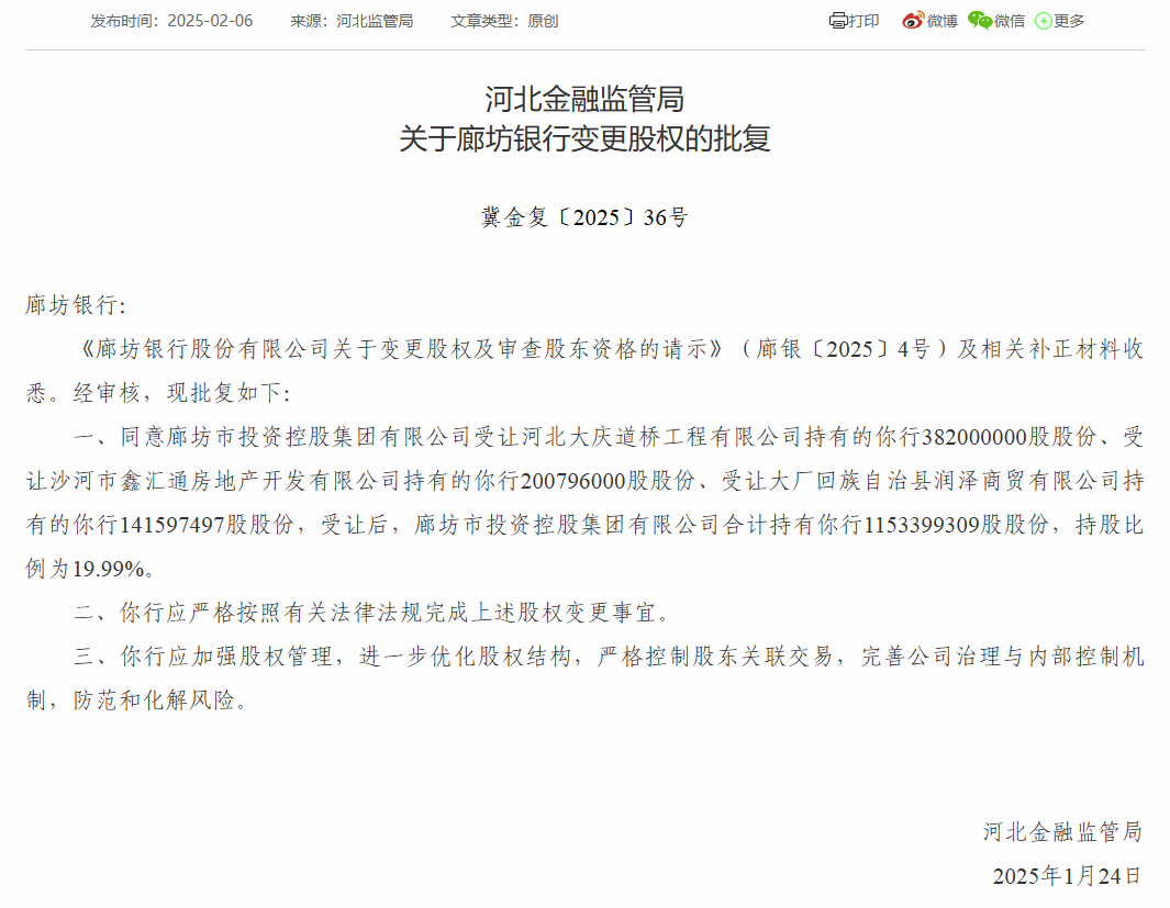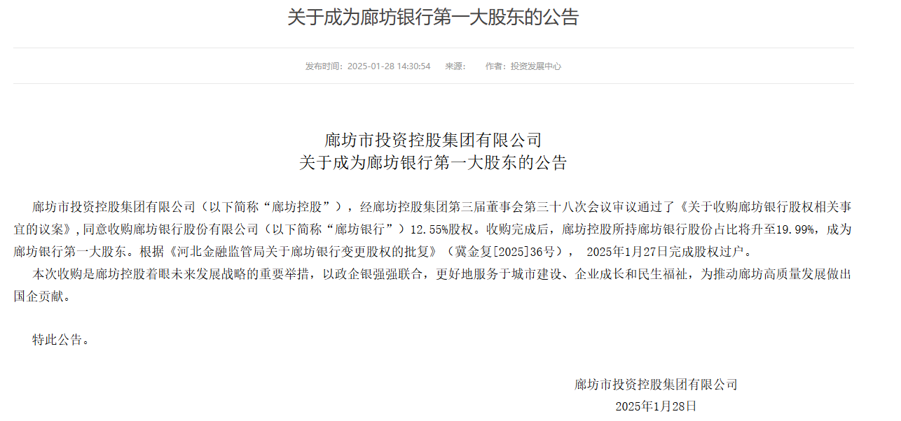 此前,廊坊市投资控股集团有限公司发布公告称, 廊坊市投资控股集团有限公司(以下简称“廊坊控股”,经廊坊控股集团第三届董事会第三十八次会议审议通过了《关于收购廊坊银行股权相关事宜的议案》,同意收购廊坊银行股份有限公司(以下简称“廊坊银行”12.55%股权。收购完成后,廊坊控股所持廊坊银行股份占比将升至19.99%,成为廊坊银行**大股东。根据《河北金融监管局关于廊坊银行变更股权的批复》(冀金复[2025]36号, 2025年1月27日完成股权过户。