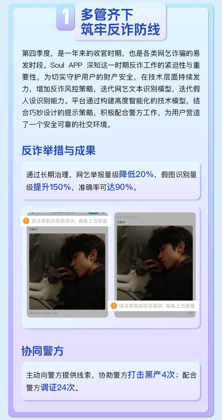 在技术层面,Soul App持续发力,增加**风控策略,迭代网络**文本识别模型和假人设识别能力。通过构建高度智能化的技术模型,平台能够精准识别各类**行为,并结合巧妙设计的提示策略,及时向用户发出预警。同时,Soul App积极与警方合作,主动提供线索,协助警方打击黑产4次,配合警方调证24次,为打击网络**犯罪提供了**支持。