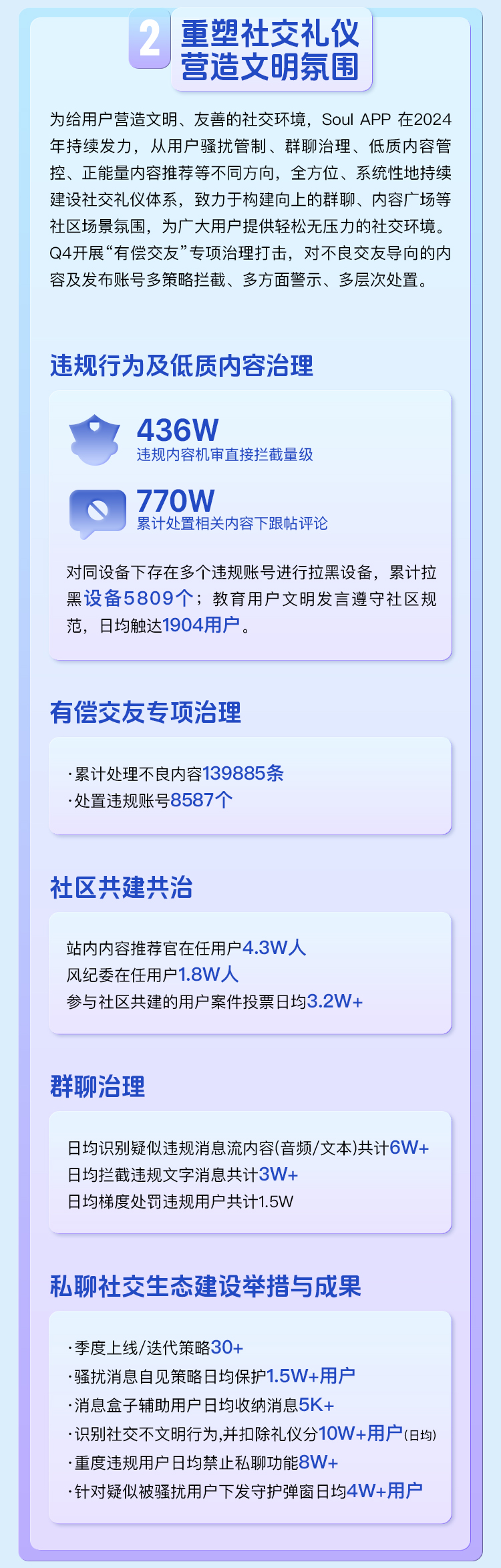社交礼仪是构建和谐社交环境的重要基石。为了给用户营造一个文明、友善的社交环境,Soul App在2024年持续发力,从用户骚扰管制、群聊治理、低质内容管控、正能量内容推荐等不同方向,全方位、系统性地建设社交礼仪体系。