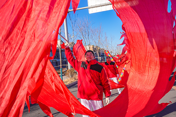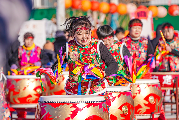 小车会表演队和传统秧歌队演员们身着五彩斑斓的服饰,在欢快的鼓点中,演绎趣味故事。