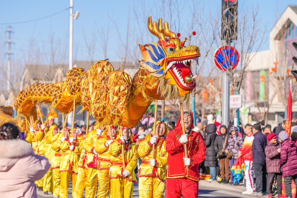 现场,长达80米的金色长龙在表演者的舞动下蜿蜒翻腾,气势磅礴,尽显威风。