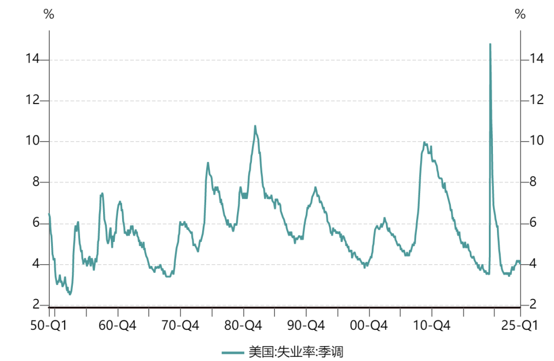 2024年美联储政策基准利率维持在4%以上,同时大体上执行了缩表政策(除了2023年上半年硅谷银行事件期间有短暂扩表),但无论是从财政支出还是财政赤字率来看,2024年的财政力度都处于历史高位,仅低于次贷危机和新冠危机期间。需要注意的是,次贷危机和新冠危机都是经济低点,当时美国的失业率都处于高位,而过去3年里美国的失业率都处于非常低的位置。