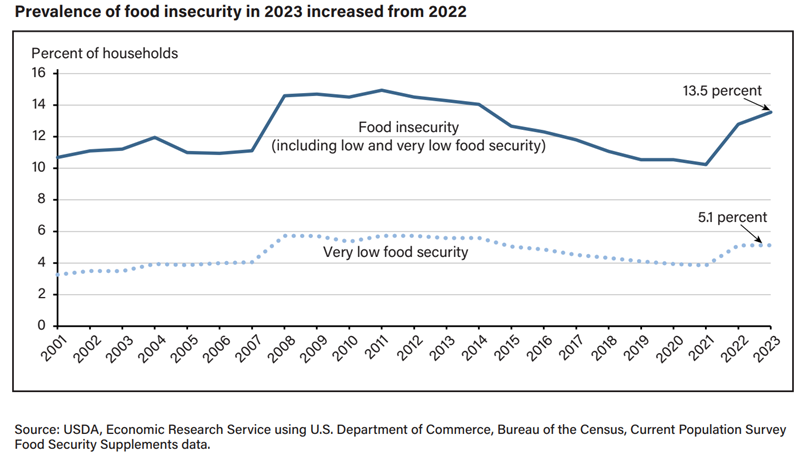 根据美国农业部经济研究局的报告,美国2023年面临食品不足的人口比例已经接近2008-2014年的那轮高点。要知道,2023-2024年美国的失业率远低于2008-2014年,这一数据的明显上升显然意味着美国底层居民的生活并不富足。虽然2024年的数据尚未公布,但不出意外的话,这一比例应该会进一步上升。