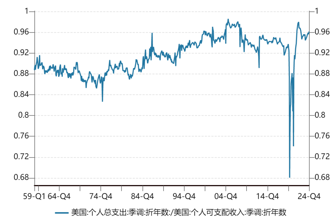 一方面,兼职情况和疫情前类似,即使多岗位持有者占比在近3年快速上升,距离历史**也仍有距离,但居民开支显示美国居民的生活压力确实比较大。当前美国居民支出占收入的比例处于历史上较高水平,仅次于2004-2008年居民大幅加杠杆,以及疫情期间政府大量补贴居民这两段特殊时期。