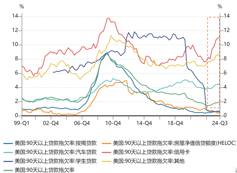 美国居民信用持续恶化,和中下层居民相关性更高的信用卡的拖欠率上升更快。