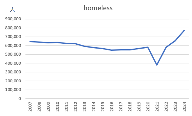 根据美国住房和城市发展部数据,2024年美国无家可归人数达到77.1万,增长18.1%,这一数据显著超过次贷危机前的水平,即使考虑人口增长亦是如此。