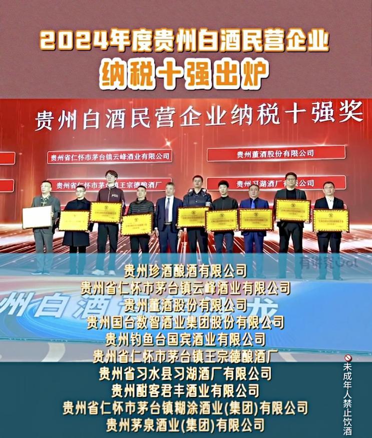 2月13日,贵州省白酒企业商会2024年年会在贵阳举行,会议发布“2024年度贵州白酒民营纳税十强”榜单,贵州珍酒位列榜首。