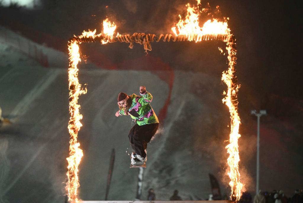 1月29日,雪友在新疆将军山**滑雪度假区新春趣味滑雪公园跳台活动上钻过火圈。新华社记者胡虎虎 摄