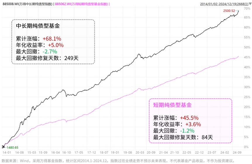 所以在风险偏好匹配的情况下,可以转向久期相对更长的中长期纯债型基金。相较于短债基金等短久期产品,中长期纯债型基金的波动和收益通常都会放大,但也也有望长期增厚投资收益。