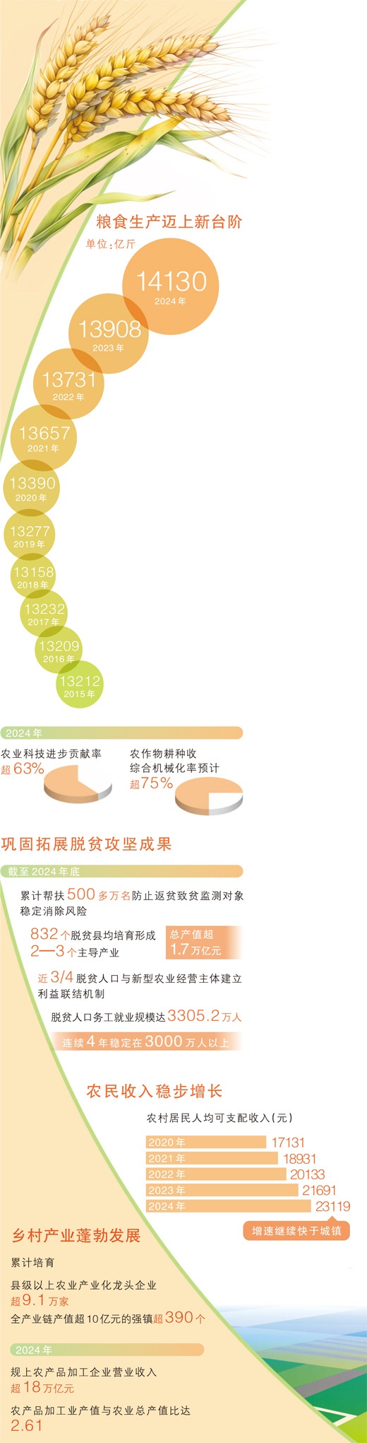 2024年,我国粮食产量**超过1.4万亿斤,迈上历史性新台阶。食用植物油自给率进一步提高,绿色优质农产品供给持续增加。