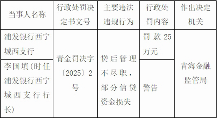 **金融监督管理总局青海监管局依据相关法律法规对浦发银行西宁城西支行罚款25万元,对李国填给予警告。
