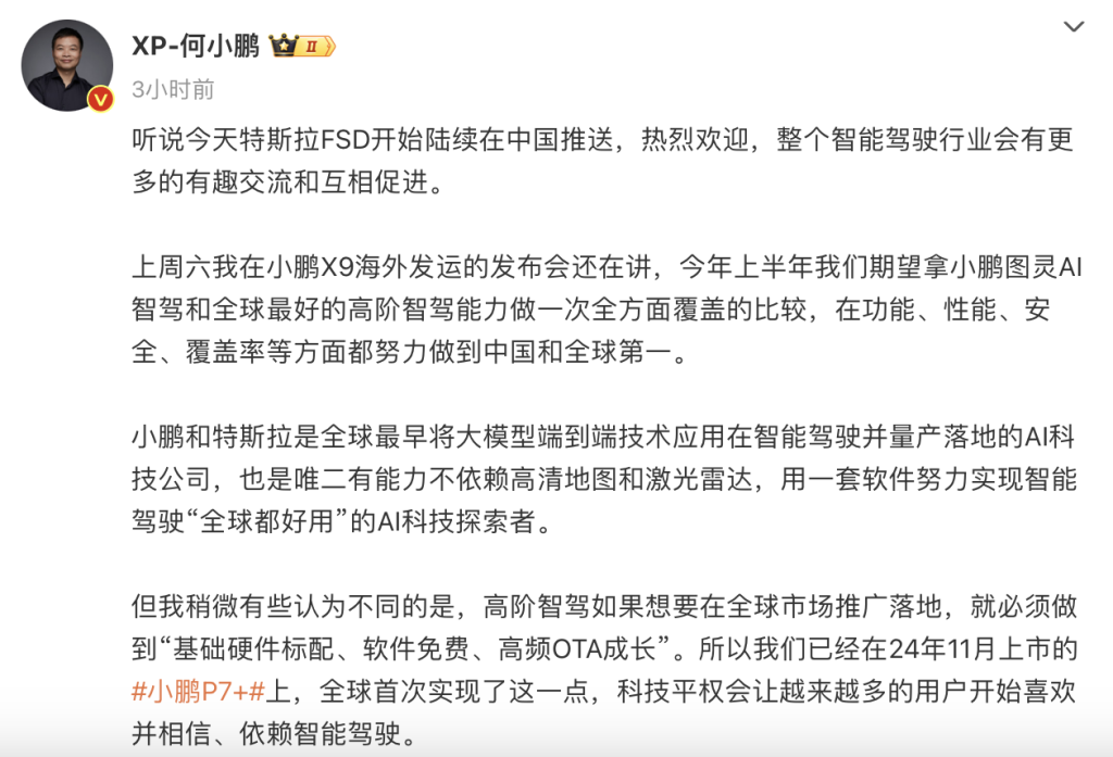 小鹏汽车CEO何小鹏25日晚间在社交媒体发文称,“听说今天特斯拉FSD开始陆续在**推送,热烈欢迎,整个智能驾驶行业会有更多的有趣交流和互相促进。”