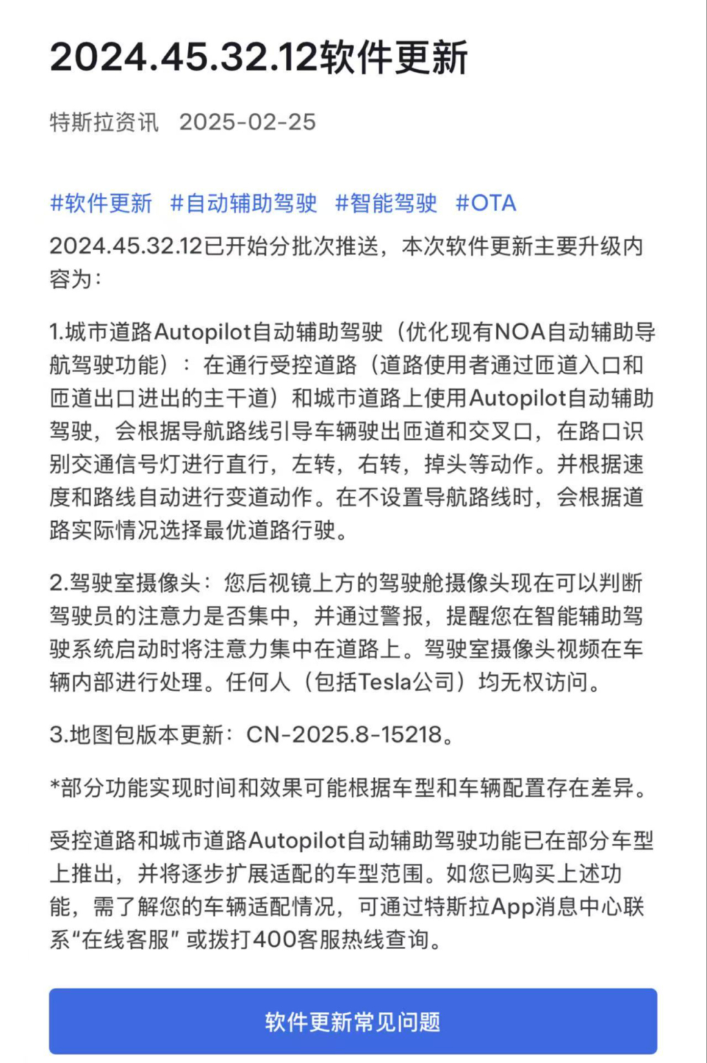 2月25日,特斯拉**微信小程序显示,特斯拉已开始分批次为客户推送2024.45.32.12软件更新。